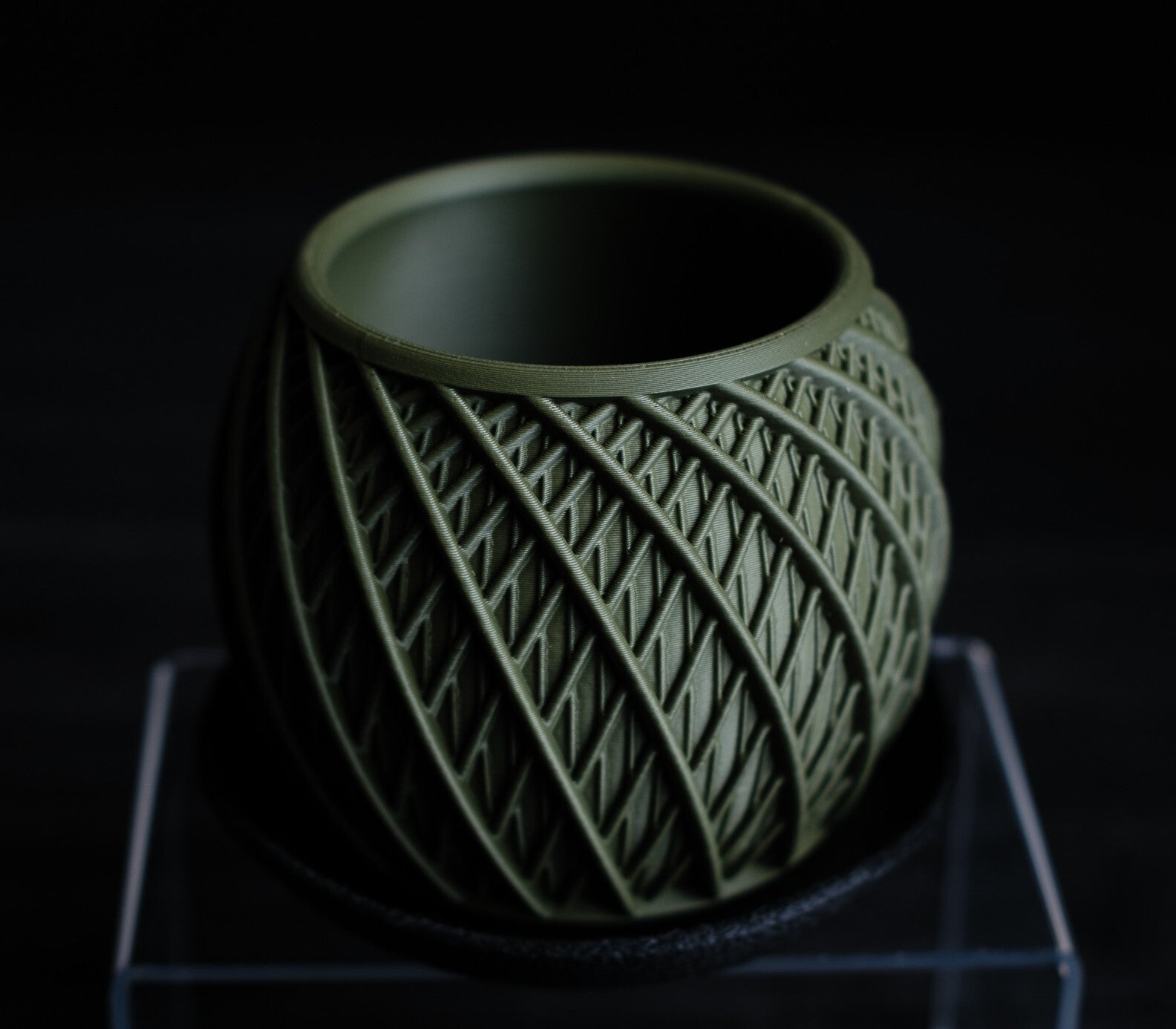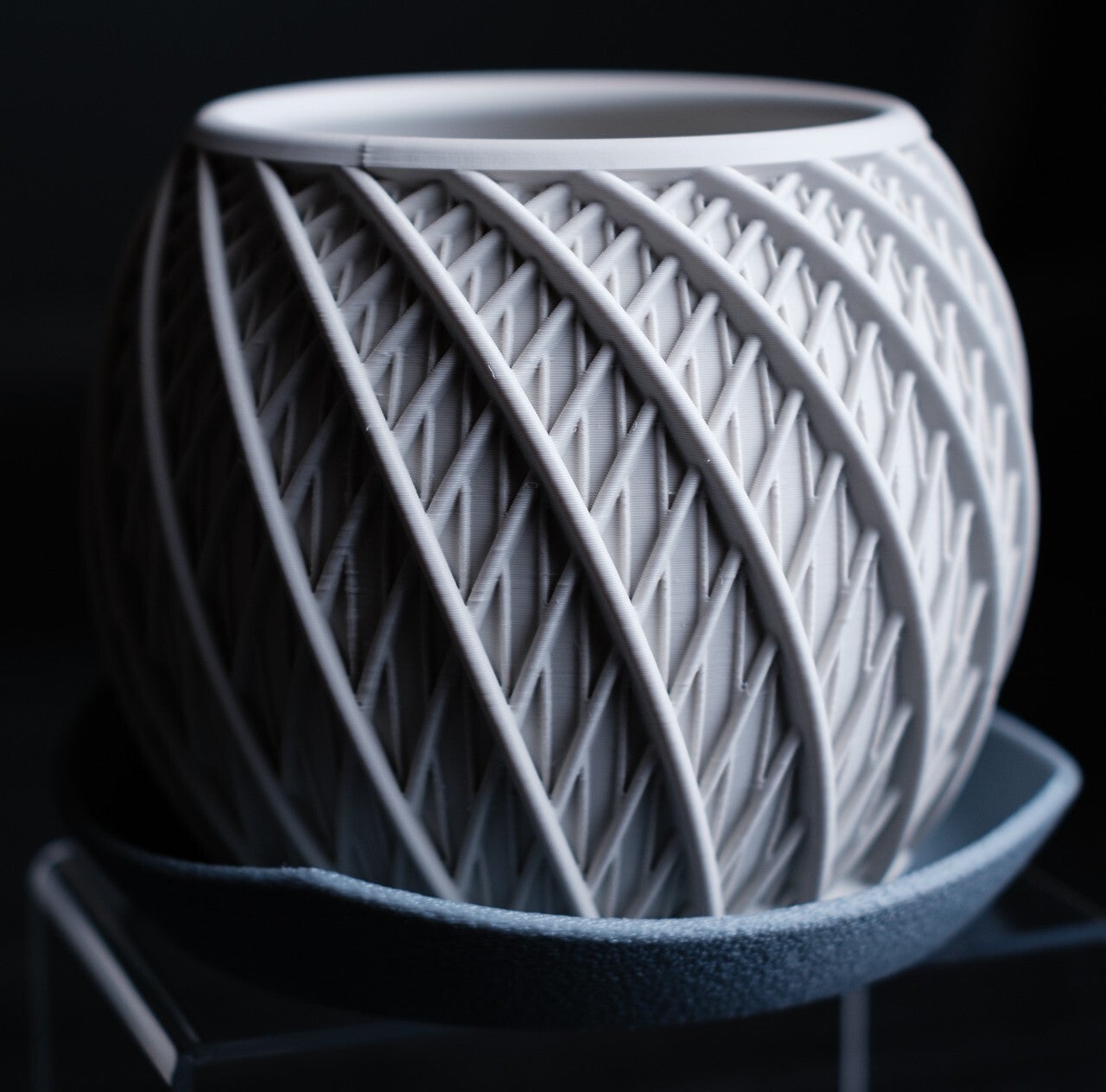 Enhance your space with a Vortex Planter—a modern decorative pot that features a spiralling geometric pattern and comes elevated on an integrated drip plate. Its design is both functional and visually striking.