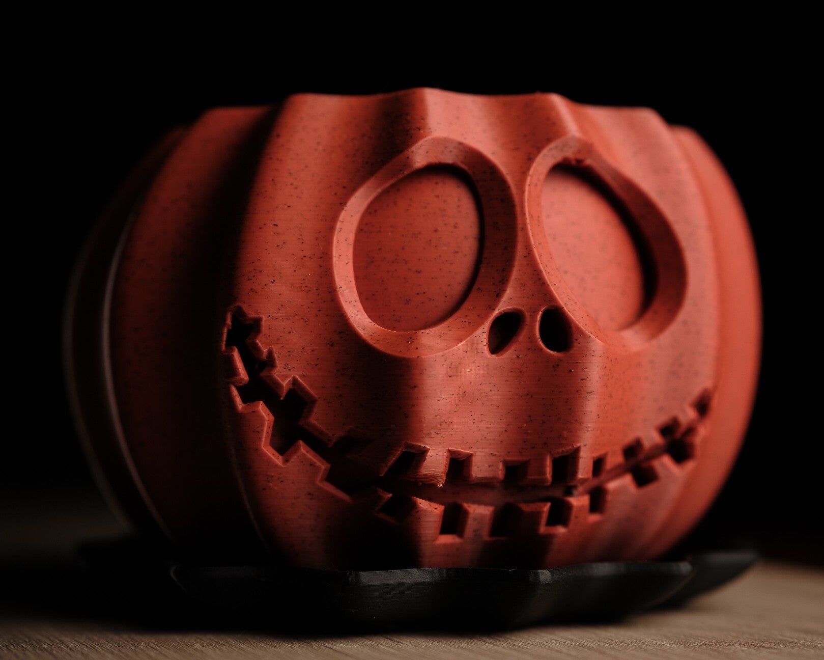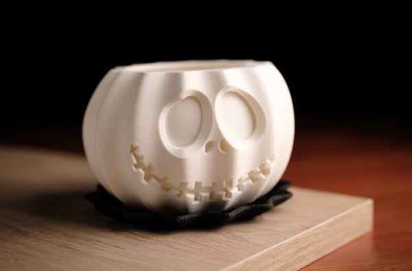 A modern, minimalist Halloween planter with sculptural charm. This design evokes the playful spirit of the season, sculpted like a carved pumpkin with friendly teeth and round eyes, complemented by a matching plate for stability and style.