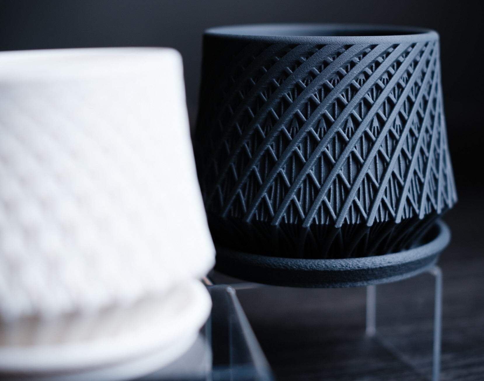 A modern, minimalist planter featuring intricate texture and a sculptural lift. The kairo planter showcases a subtle pattern that’s elevated on a built-in drip plate—striking an elegant balance between form and function.