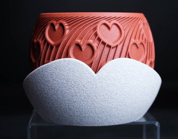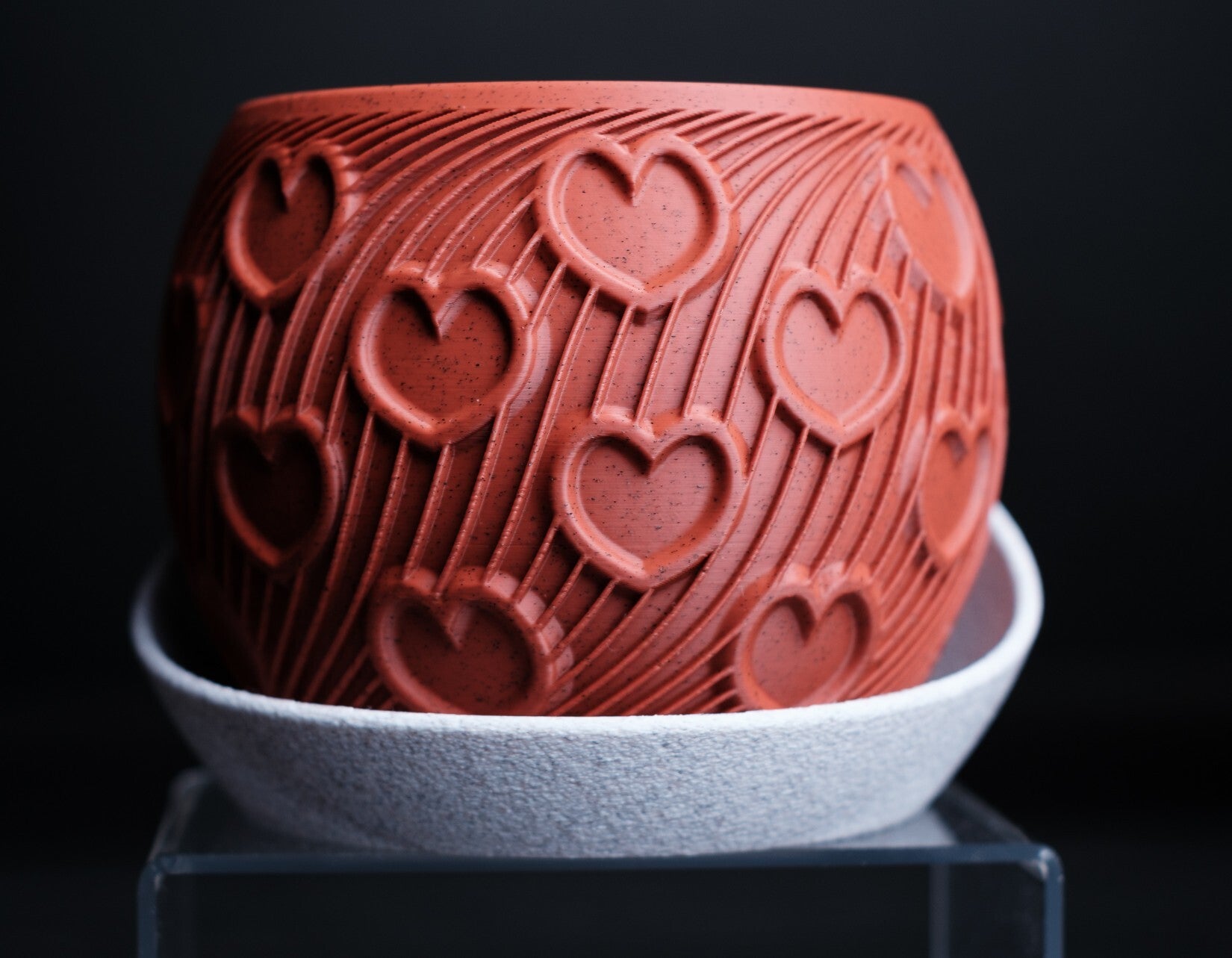 A modern, minimalist planter celebrating thoughtful design with a heart motif. The heart planter is a Valentine’s-themed creation featuring raised heart patterns and flowing curves, perfect for contemporary decor or thoughtful gifting.