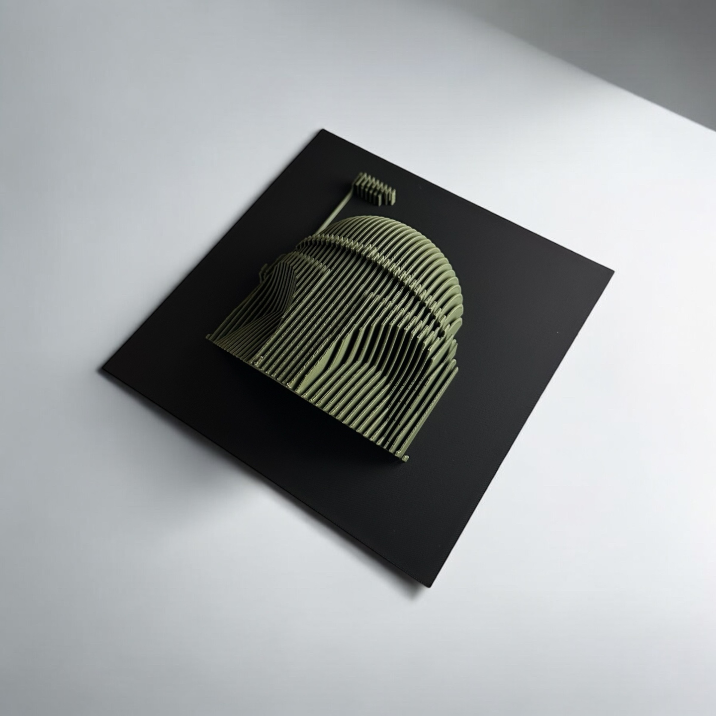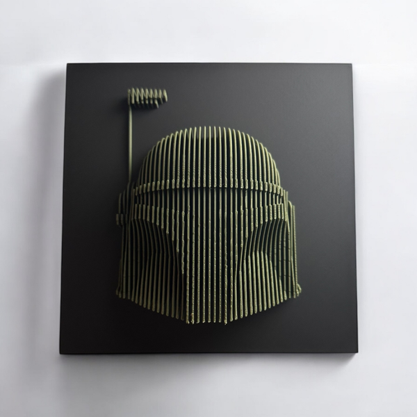 A sculptural wall piece that reimagines Boba Fett through bold, stacked contours. The layered construction highlights the iconic helmet silhouette with striking depth and shadow, transforming a legendary design into modern, minimalist wall art. Perfect for framing, gifting, or gallery-style display.