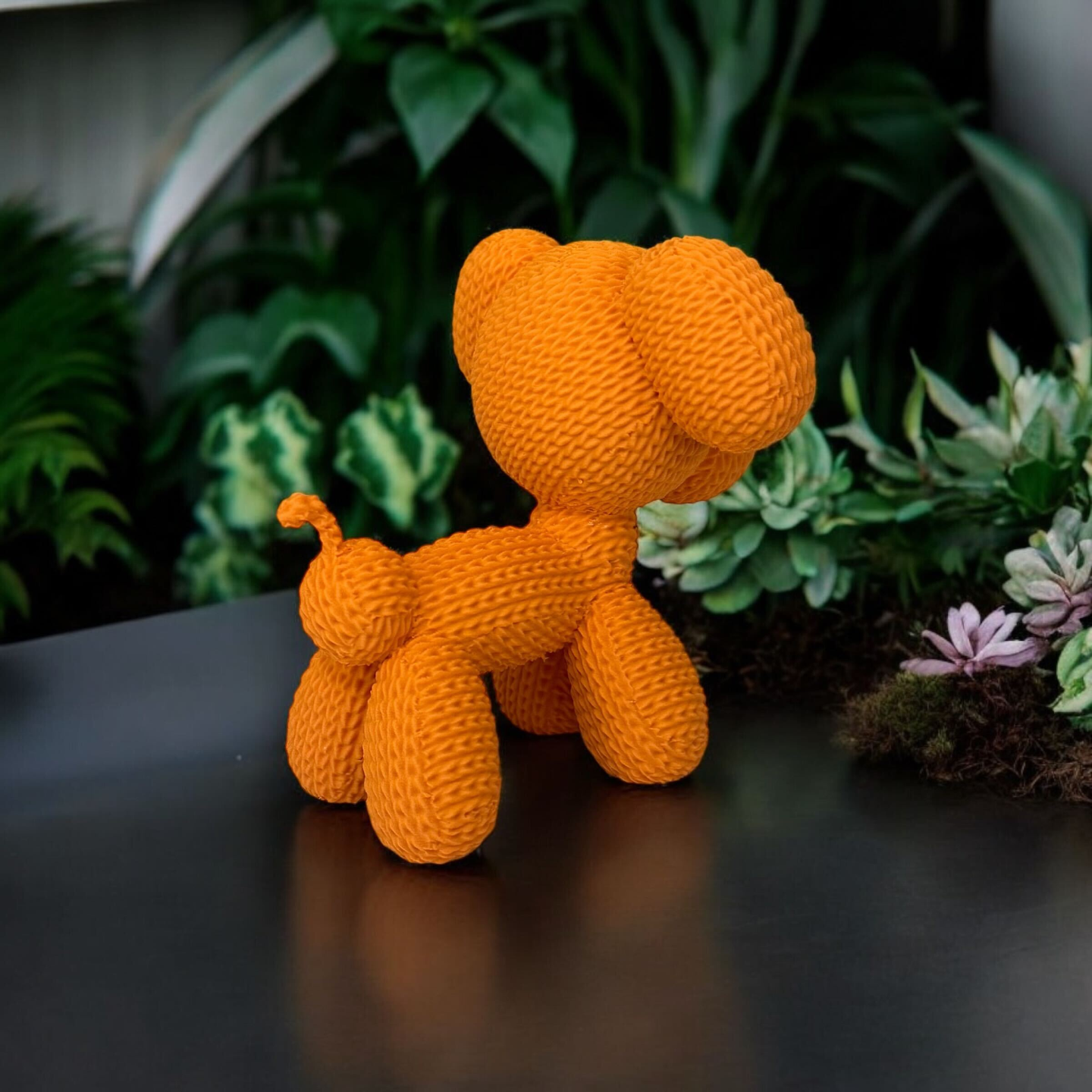 A delightful miniature model with charming, knitted-inspired style. This playful rendition of a balloon dog mimics the softness of a knit toy—perfect for display as a standalone object or whimsical gift.