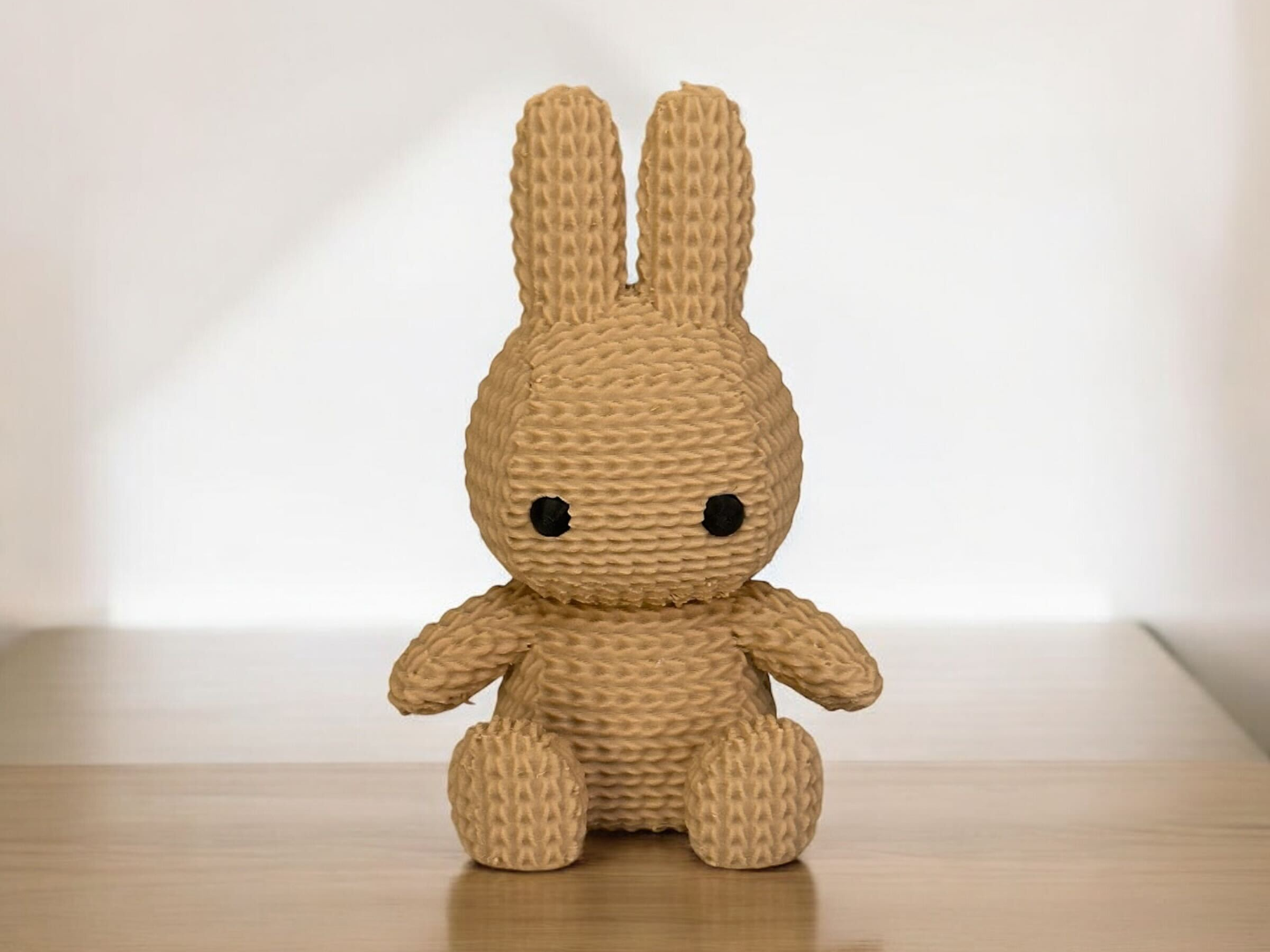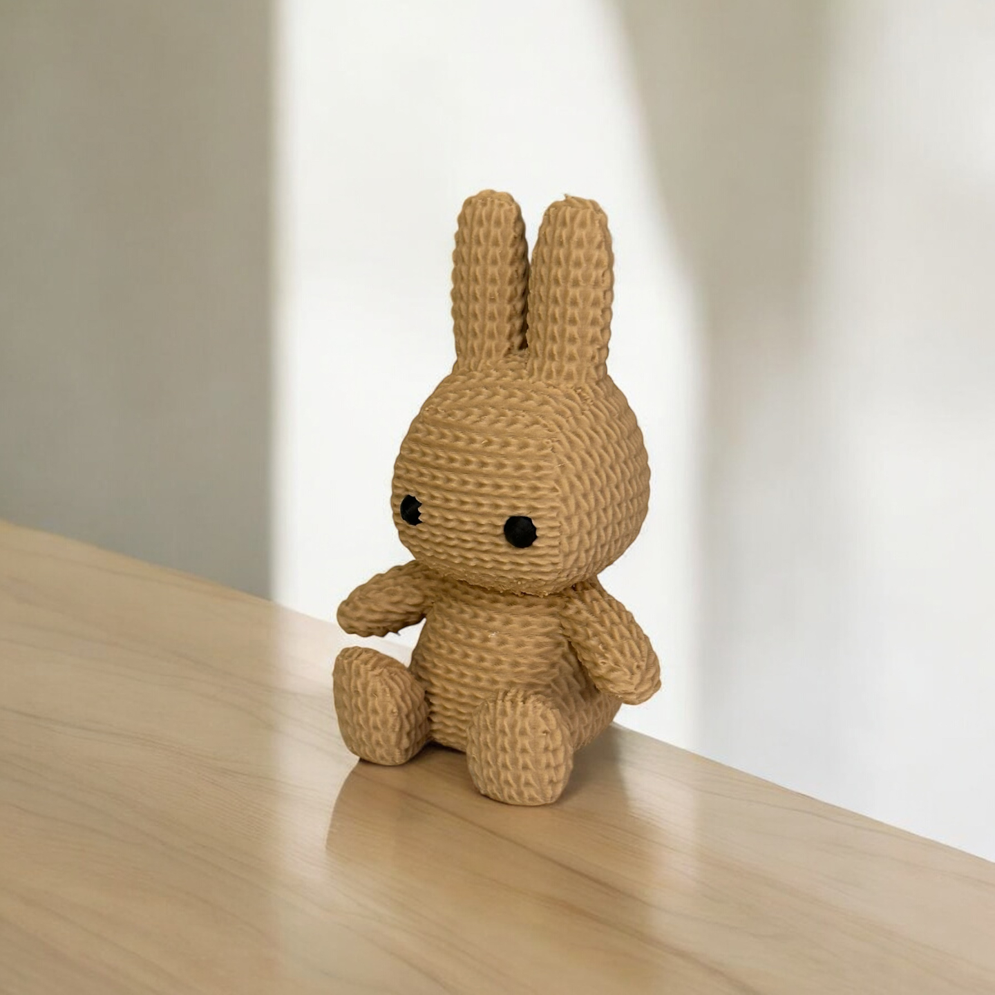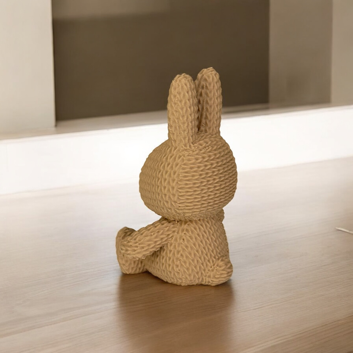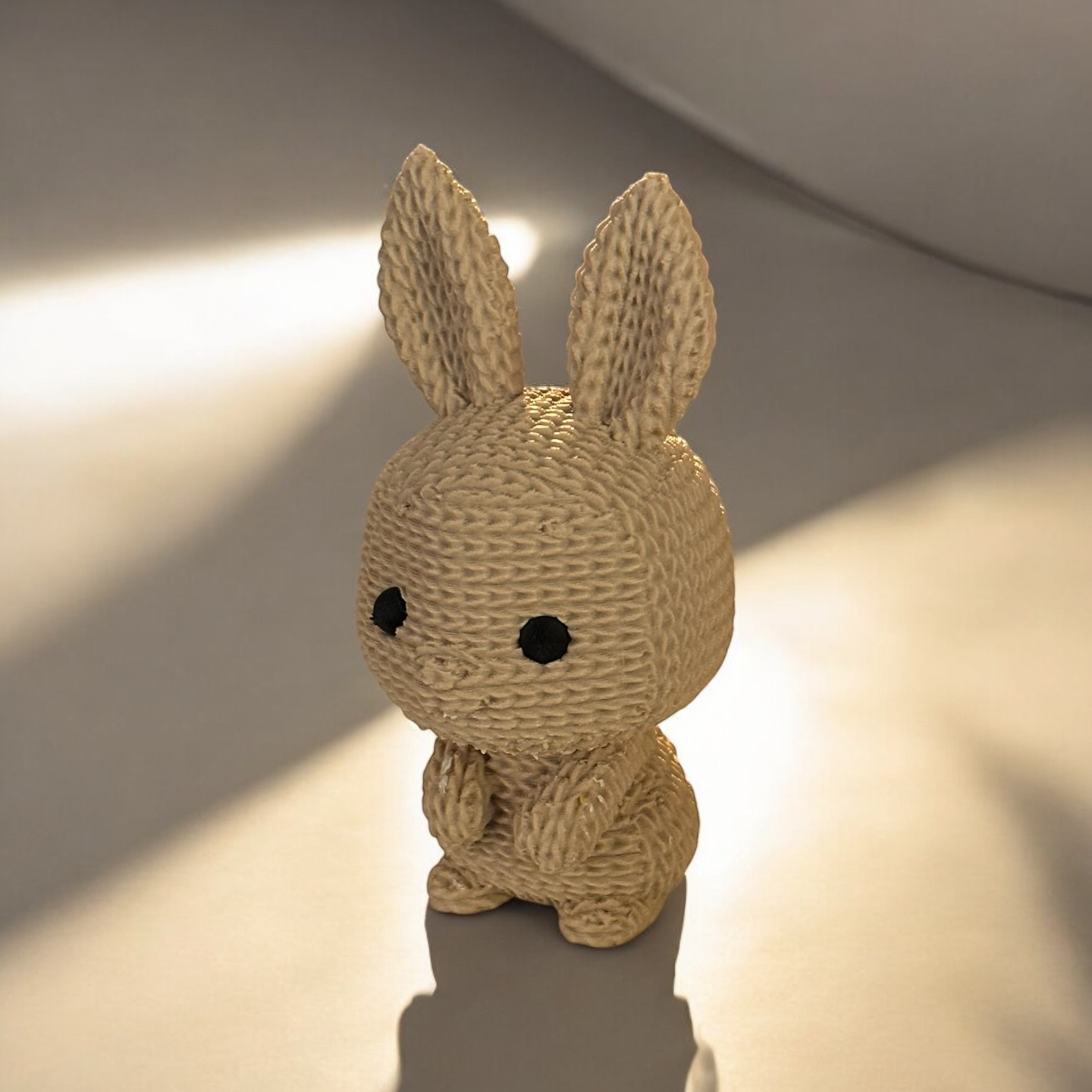 Cute nitted-style miniature with whimsical appeal. This bunny evokes the warmth of a snug toy through 3D-printed detail and charming form—perfect for Easter décor, desks, or gifting.