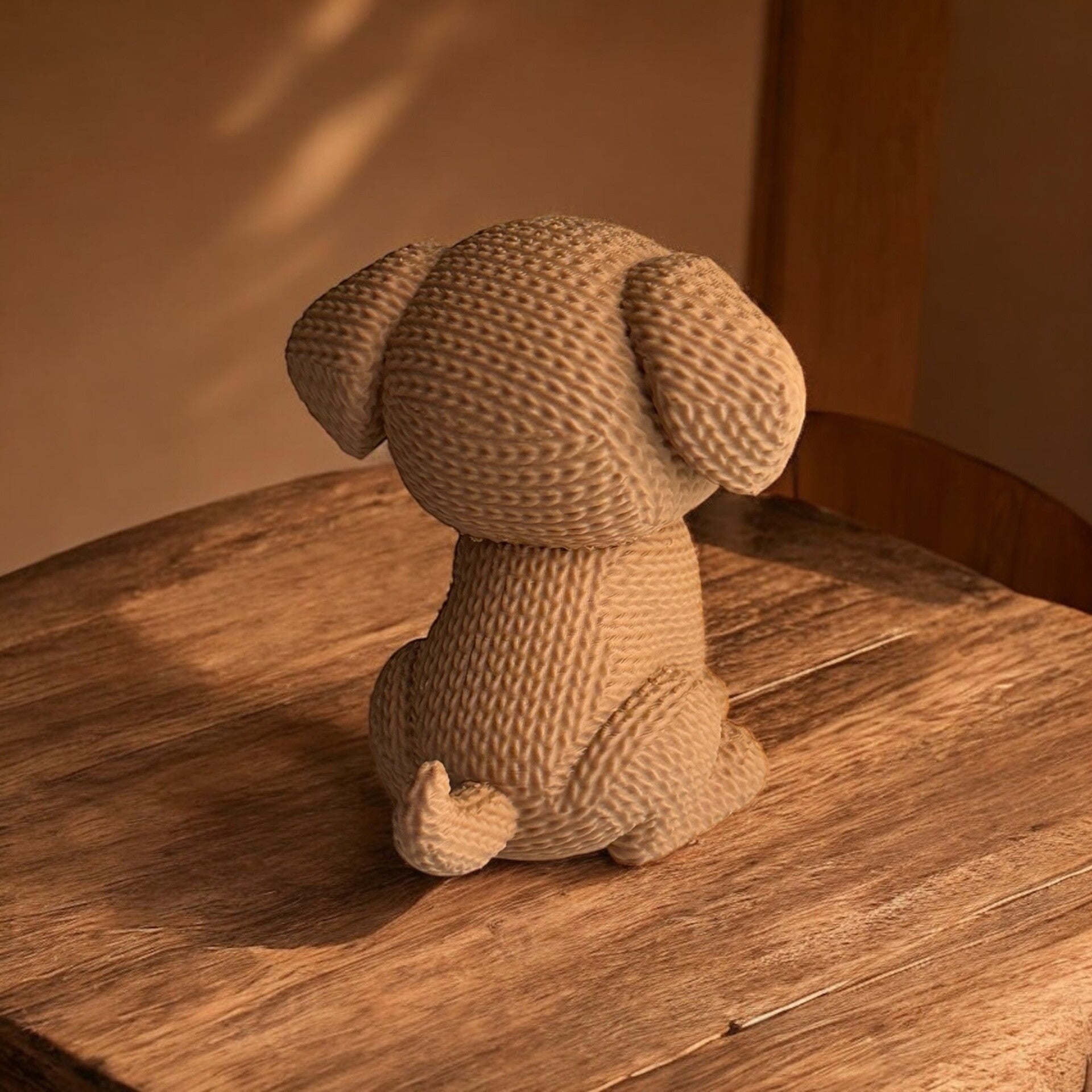 A charming miniature with cosy knitted style. This delightful model brings the soft warmth of knitwear into 3D form, capturing the playful essence of a little dog in sculptural detail.