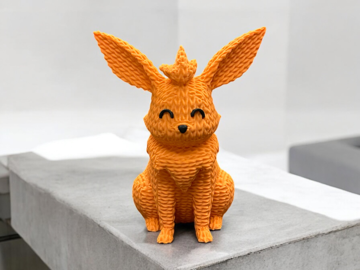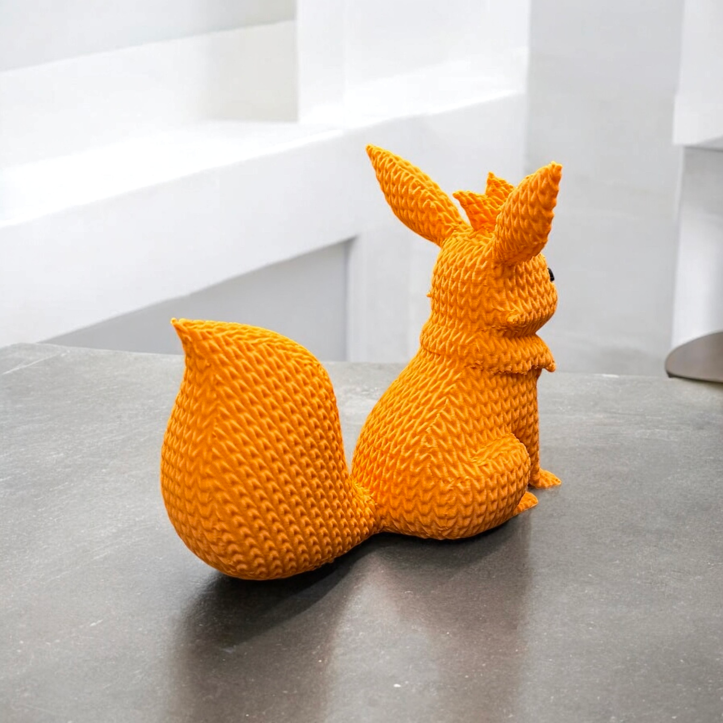 A charming amigurumi-style Flareon that blends whimsical character with 3D-printed precision. This miniature reimagines the iconic Fire-type Pokémon as a textured knitted figure—adorable, handcrafted in appearance, and beautifully modern in form.