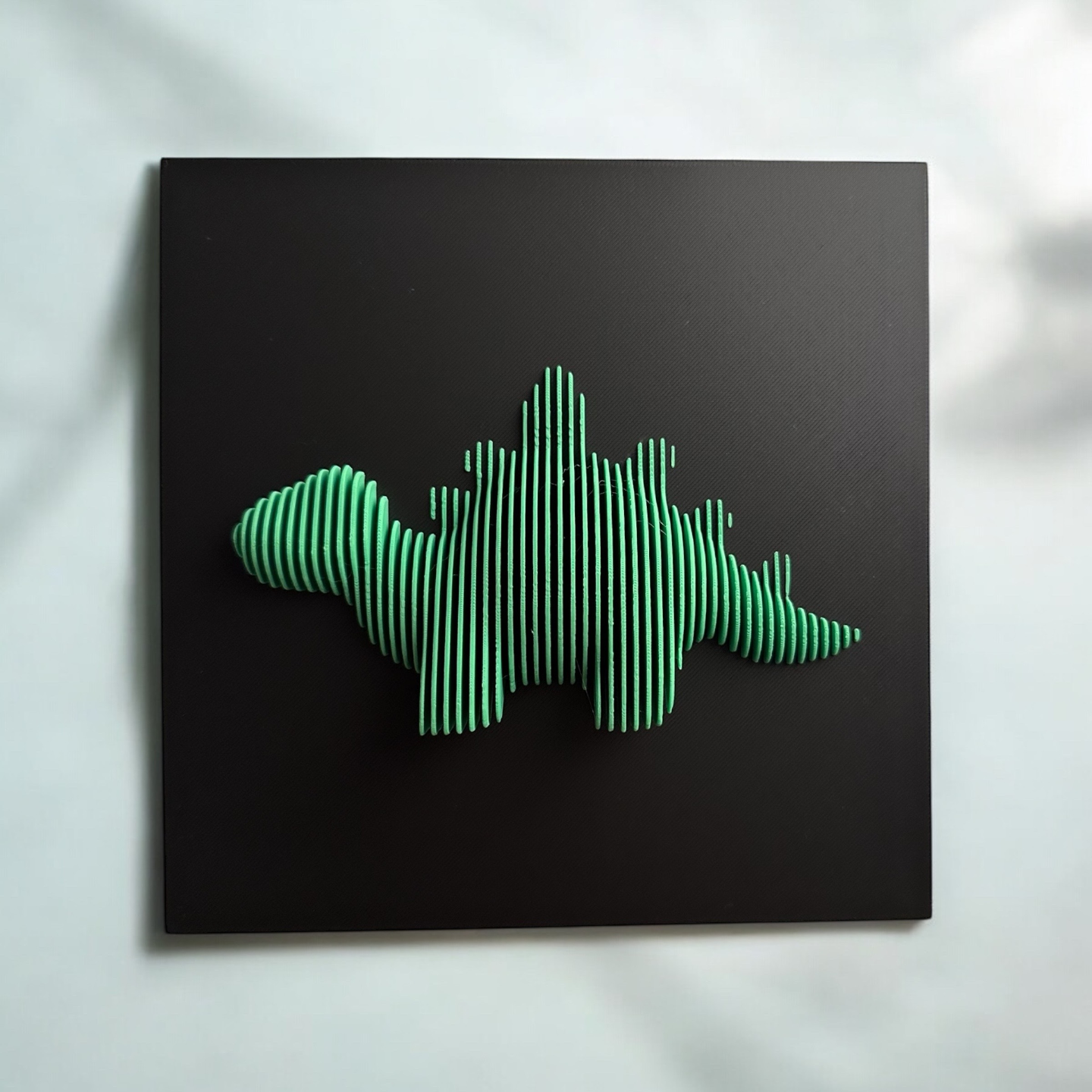 A fun and detailed layered wall sculpture capturing the iconic silhouette of a stegosaurus.
