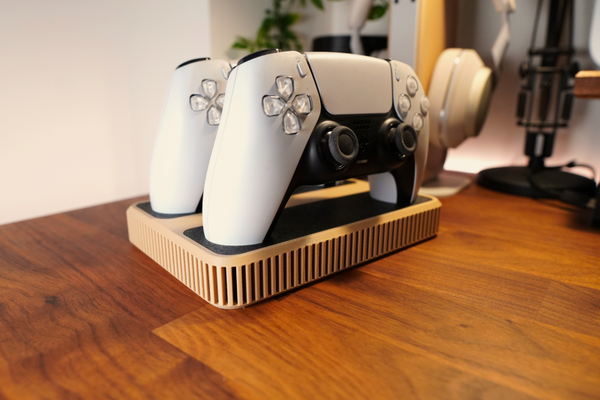 A dual-sleeve controller stand with a clean slatted design. Display two gamepads side by side while keeping your setup tidy—perfect for desks, media units, or streaming backdrops. Smooth contact points protect grips and sticks, while the stable base ensures everything stays secure.