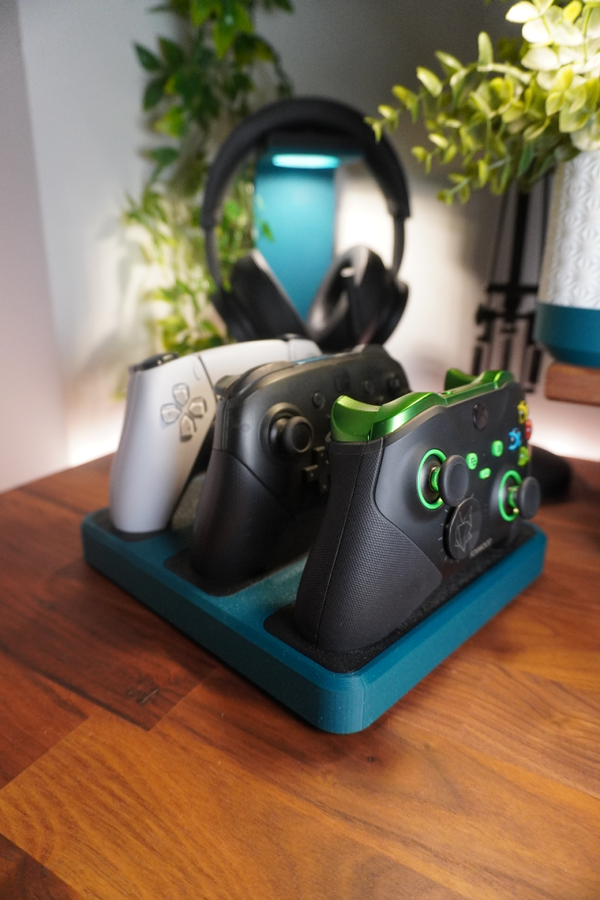 Trifectaa triple-sleeve controller stand that keeps three gamepads upright, tidy, and ready to grab. The clean, modern base displays your controllers side by side—great for desks, media units, or streaming backdrops—while smooth contact points protect grips and sticks.