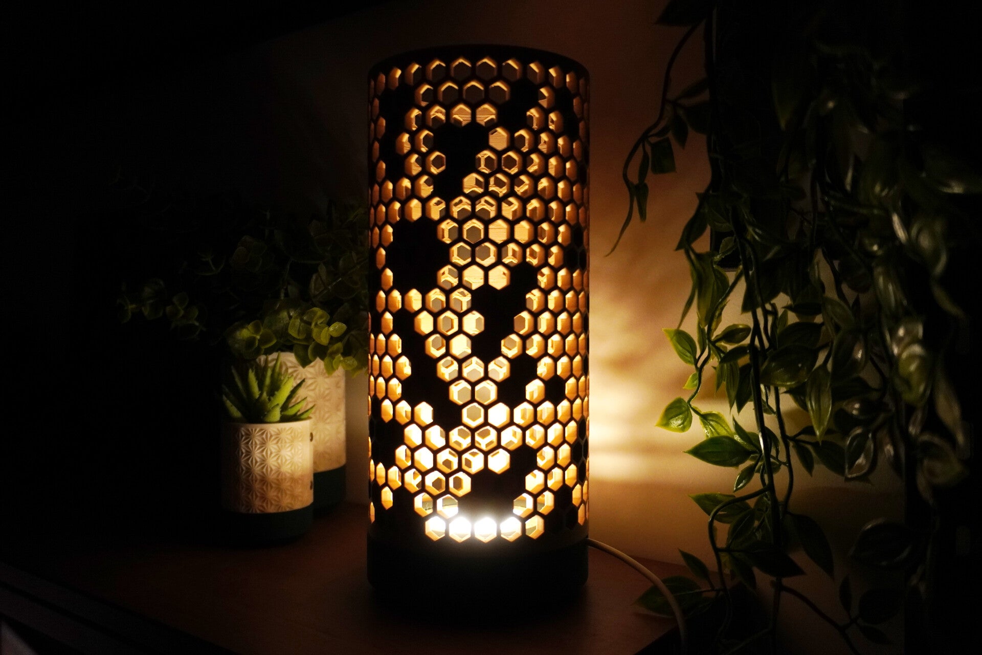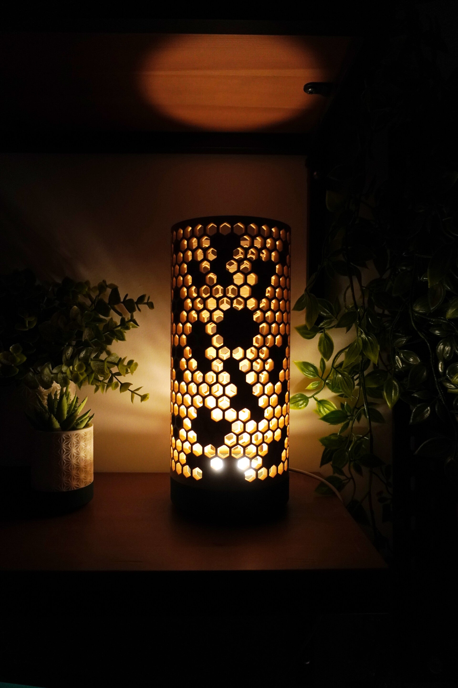 A striking honeycomb “exo” lampshade that wraps light in a geometric lattice. The open exoskeleton creates crisp patterns on nearby walls while the clean silhouette keeps your bedside, shelf, or desk looking minimal and modern.