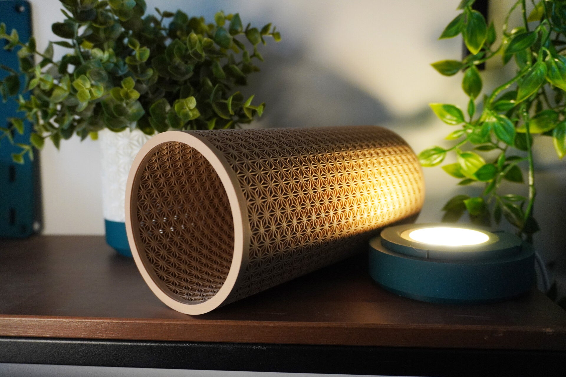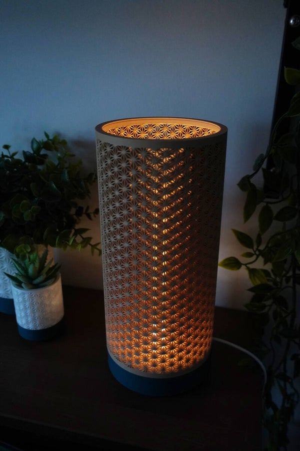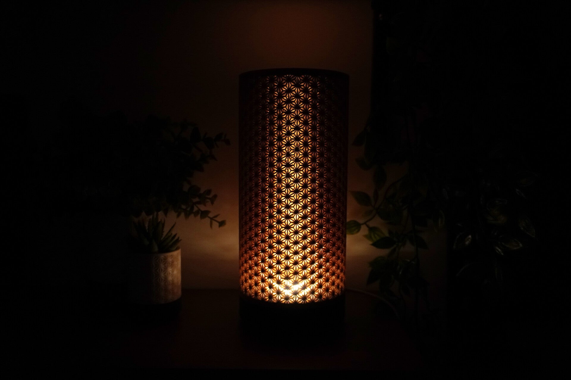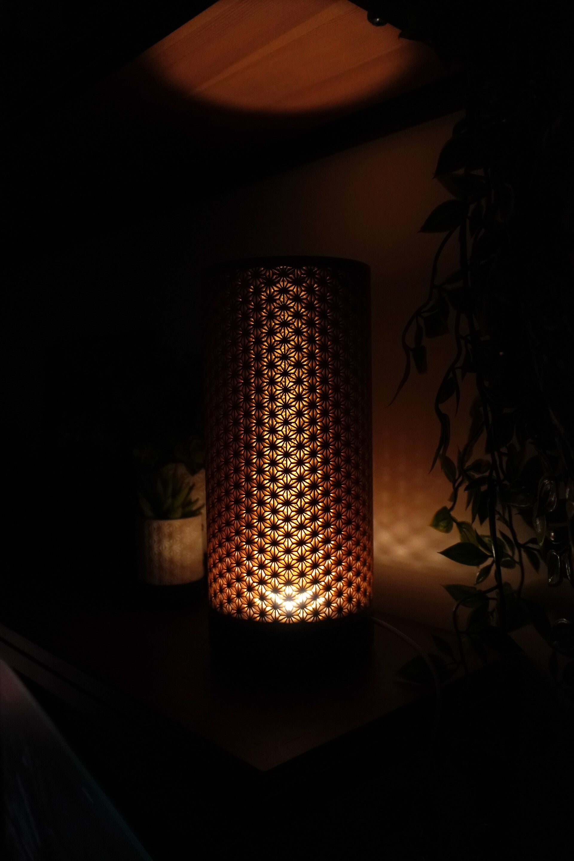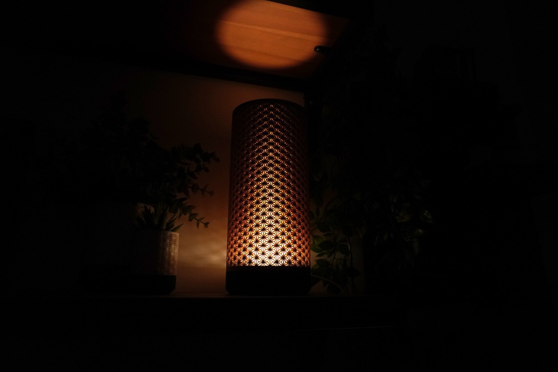 A kumiko-inspired “exo” lampshade wrapped in a geometric lattice. The open exoskeleton throws elegant patterns on nearby walls while the clean silhouette keeps your bedside, shelf, or desk looking minimal and modern—ideal for cosy ambient light with an LED bulb.