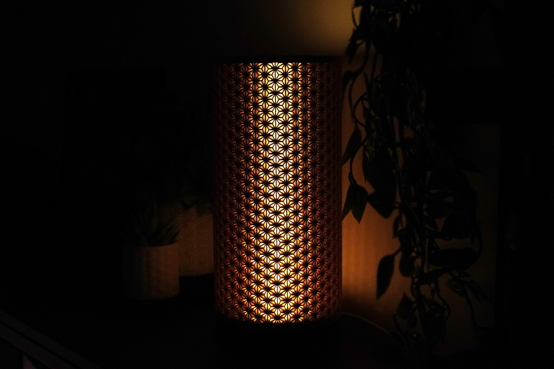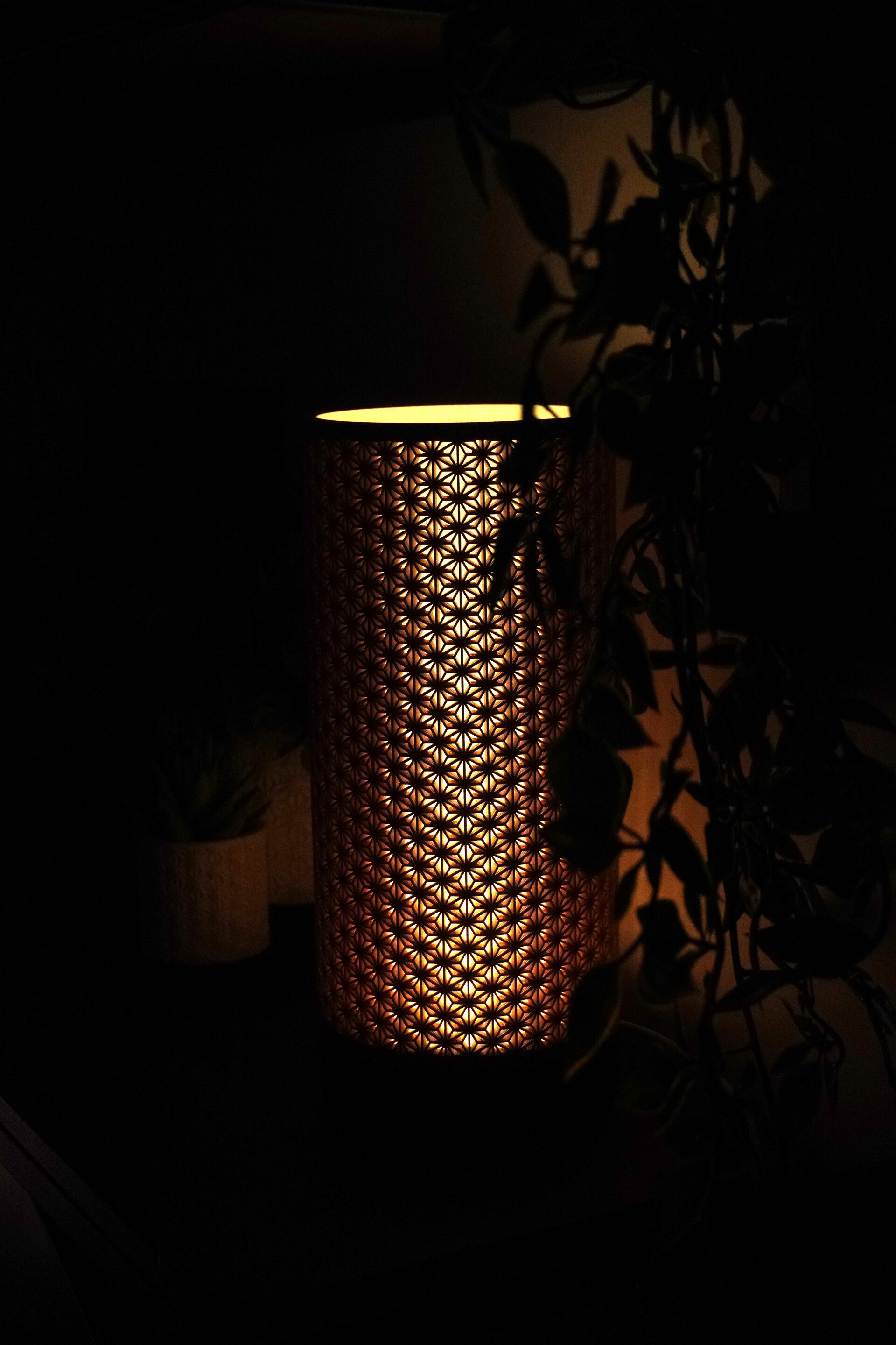 A kumiko-inspired lampshade with crisp geometric lines that cast elegant patterns of light. The clean, modern silhouette keeps your setup minimal while adding a warm ambient glow to a bedside table, shelf, or desk.