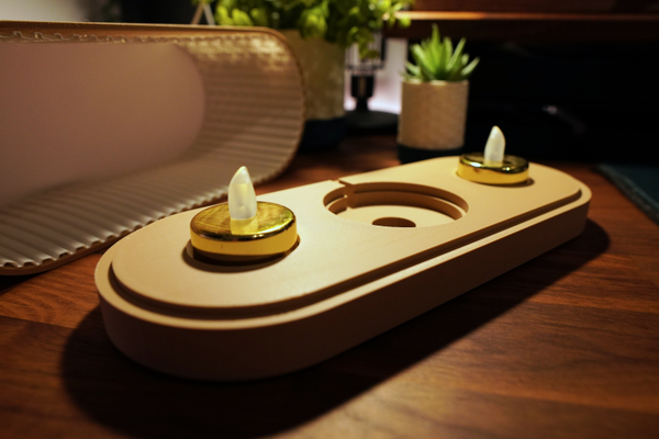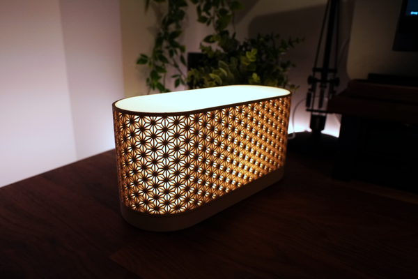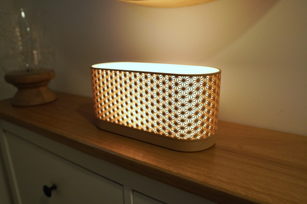 A kumiko-inspired lampshade with interlocking geometric forms that cast elegant, patterned light. The sculptural lattice keeps the look clean and modern while adding a warm ambient glow to a bedside table, shelf, or desk.