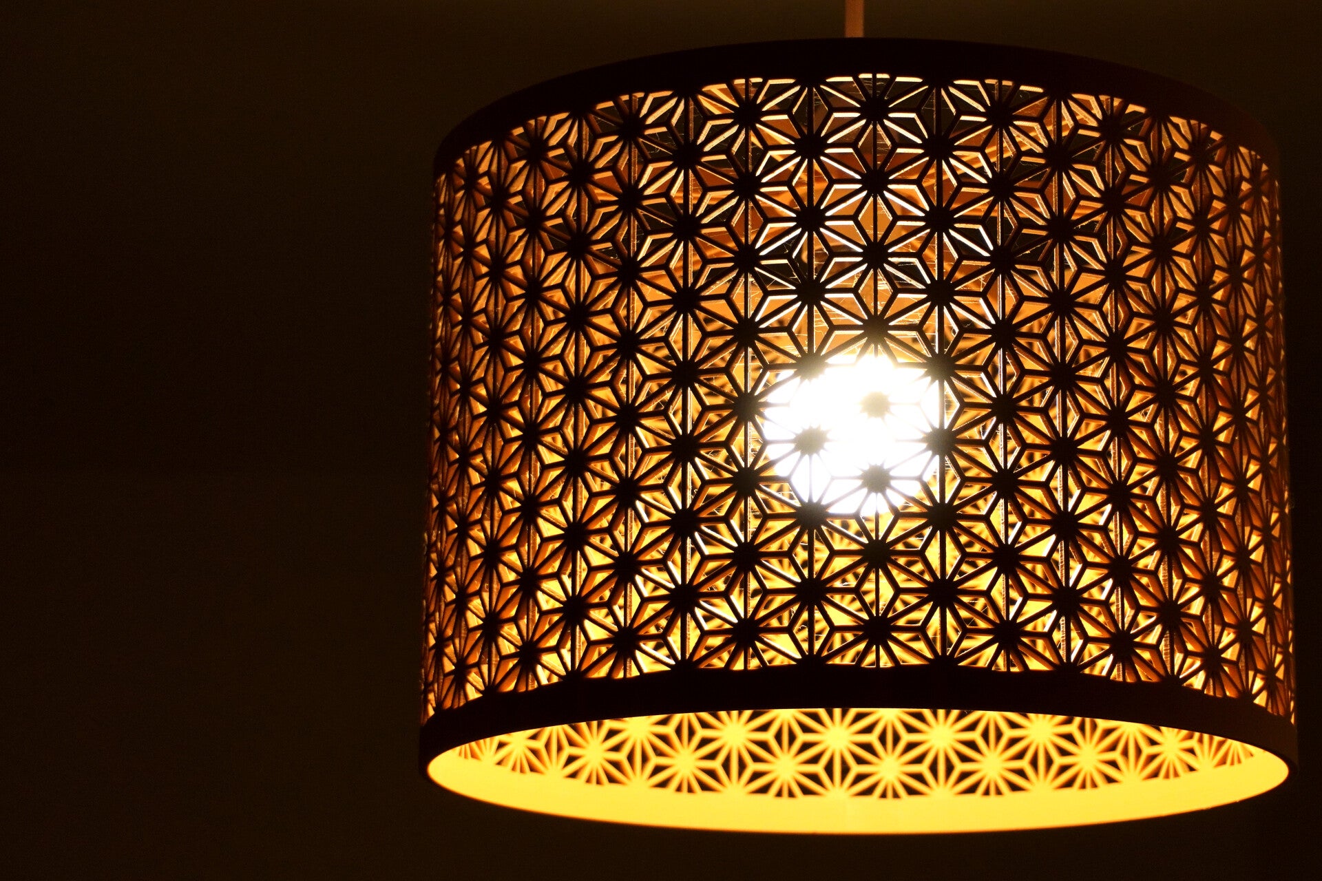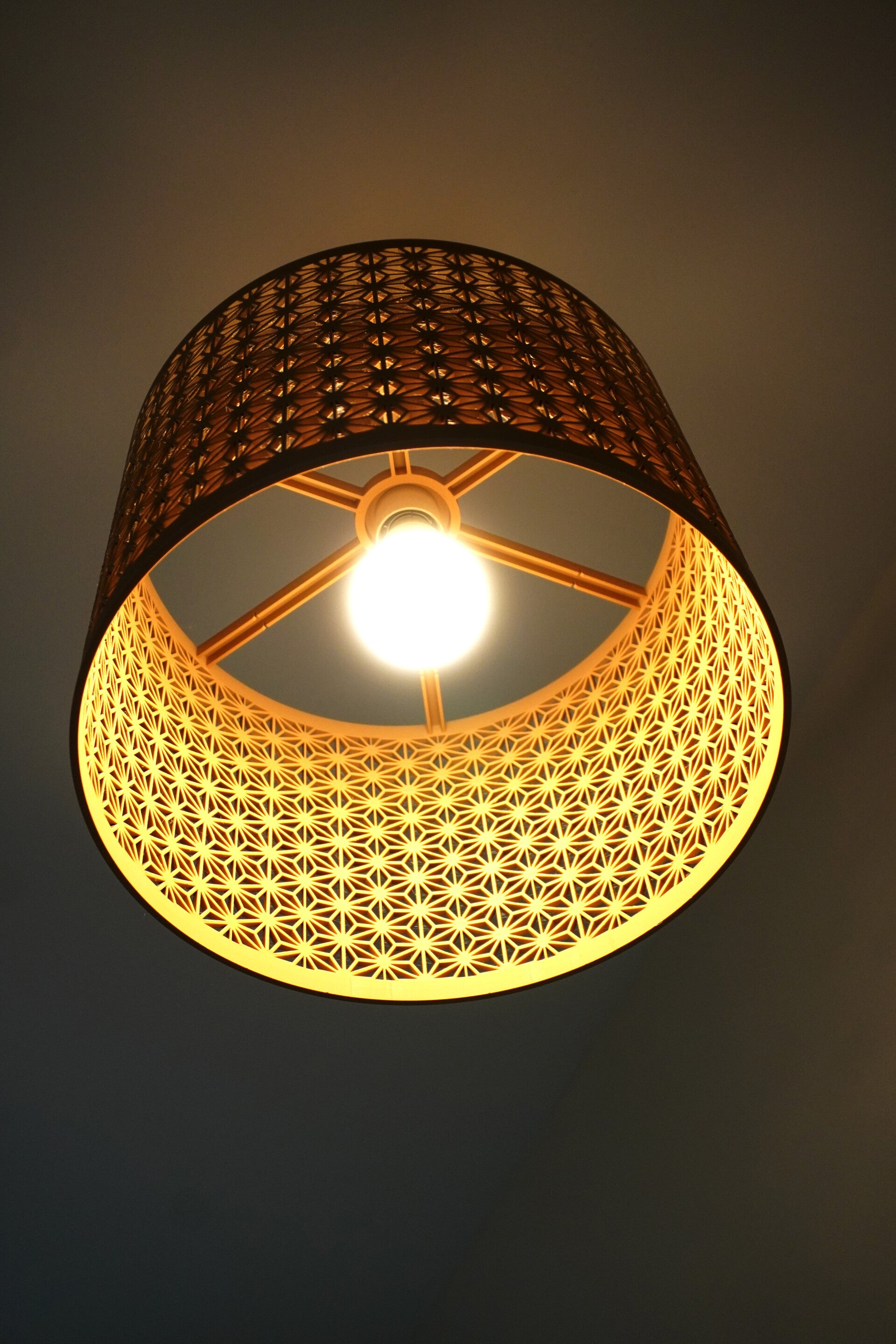 A large kumiko-inspired ceiling lampshade that makes a sculptural statement. The geometric lattice casts elegant patterns while the clean silhouette keeps living rooms, dining areas, and entryways feeling calm and modern with a warm ambient glow.
