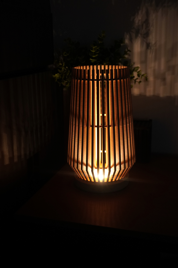 A modern slatted lampshade that casts crisp bands of light for a cosy, ambient glow. The clean, architectural profile looks striking on a bedside table, shelf, or desk while keeping your setup minimal and uncluttered.