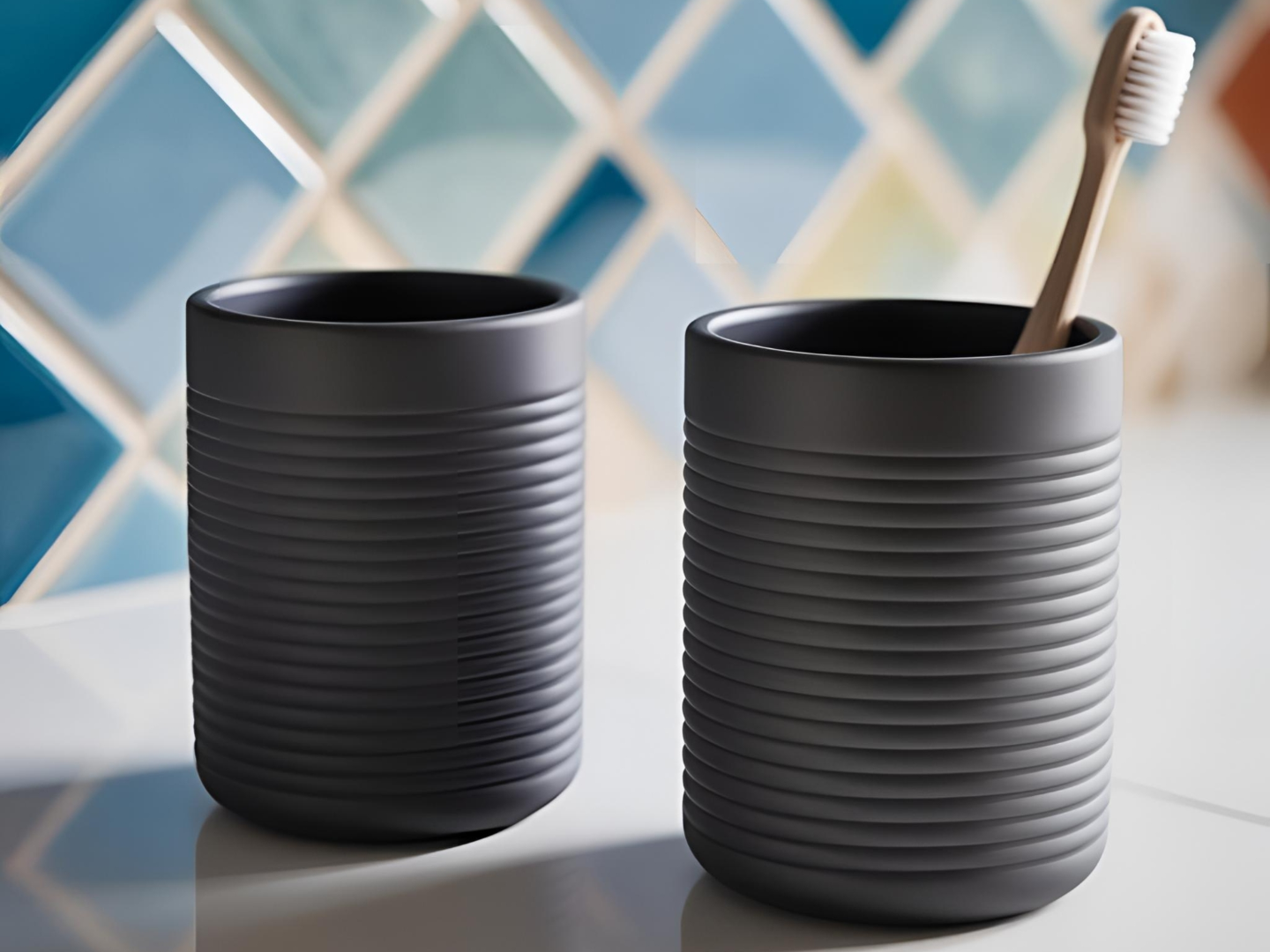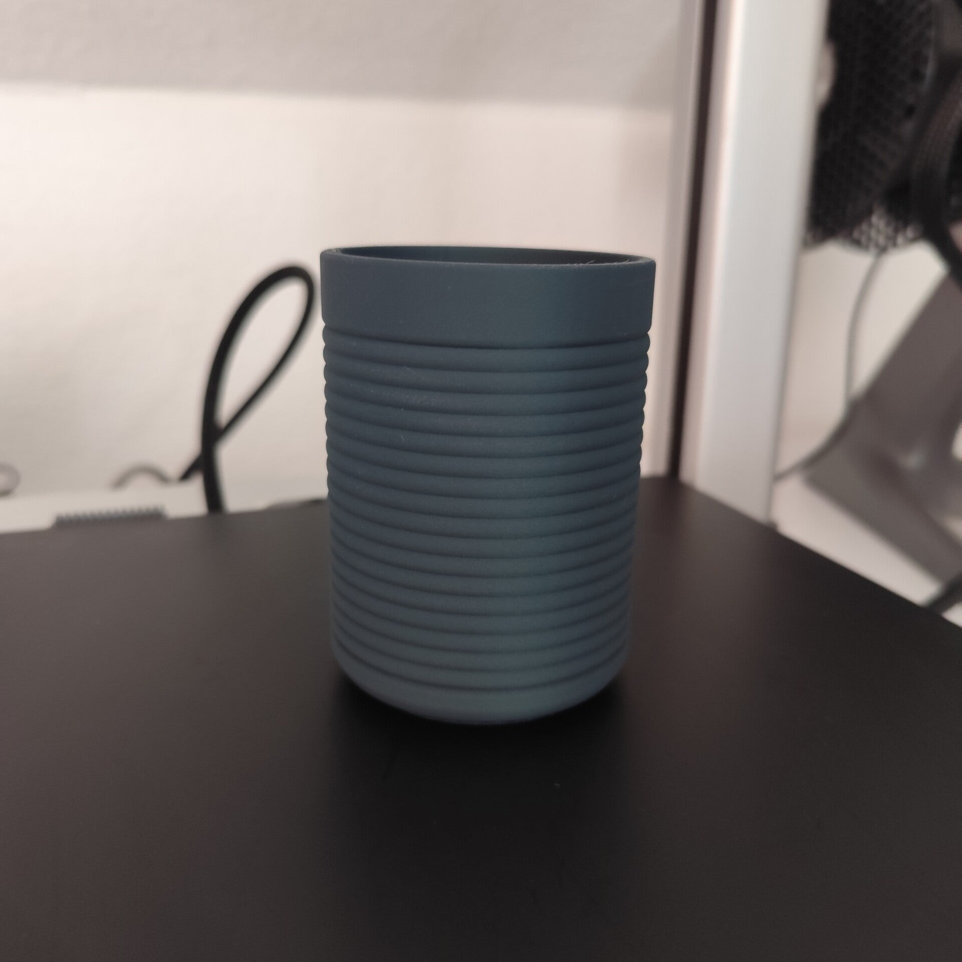 A modern, ribbed organiser suitable for holding toothbrushes, pencils, pens, or other similar items. Its horizontal rib texture offers both aesthetic flair and tactile appeal, while the minimalist design ensures it fits seamlessly into bathroom vanities, desks, or any tidy space.