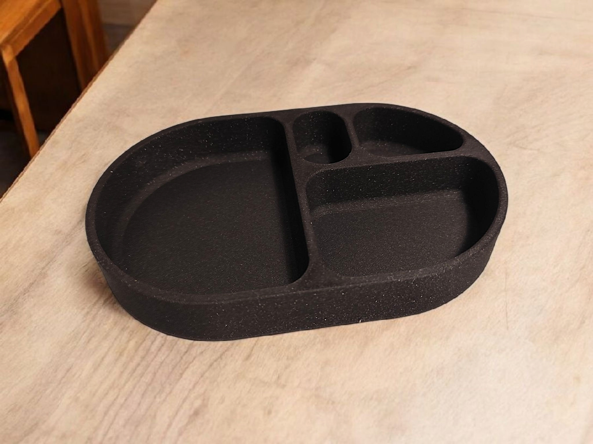 A modern-designed tray ideal for catching keys, coins, and other small everyday items. Its softly rounded edges offer both aesthetic appeal and practical tidiness.