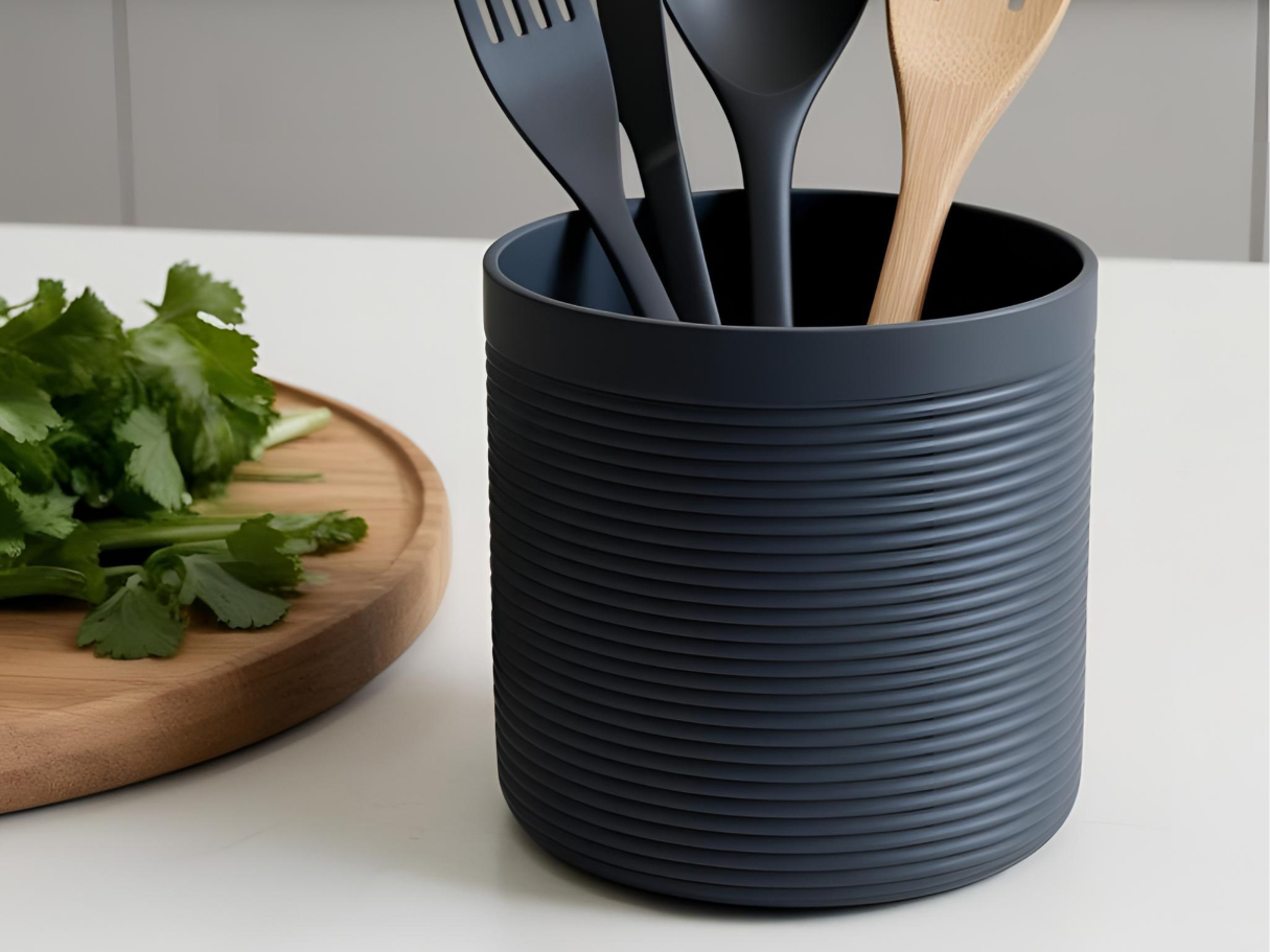 A roomy, ribbed utensil holder designed to beautifully display and organise kitchen tools. Its integrated rib-circle detailing not only adds elegant texture but also helps keep utensils upright and accessible.