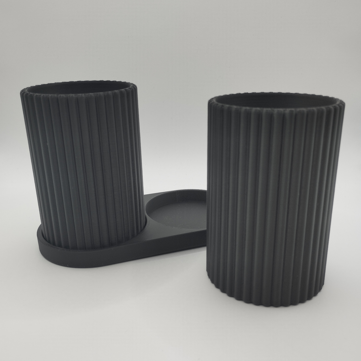 A modern ribbed set featuring two toothbrush cups and a matching base tray. Designed to neatly organise toothbrushes and keep your bathroom countertop tidy with minimalist elegance.