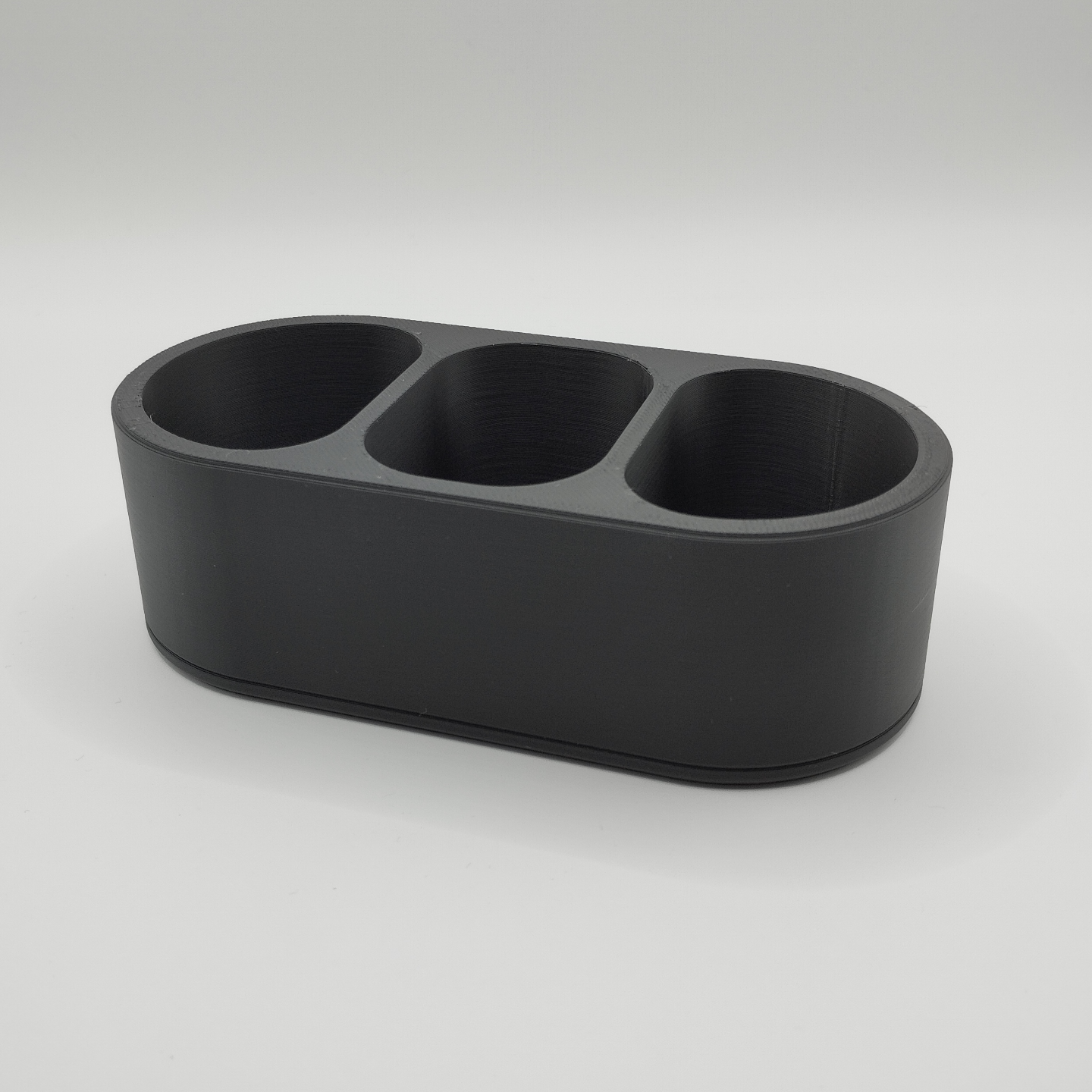 A sleek, softly curved caddy designed to discreetly corral remote controls and other small items in classic minimalist style. It's perfect for decluttering your coffee table or living area.
