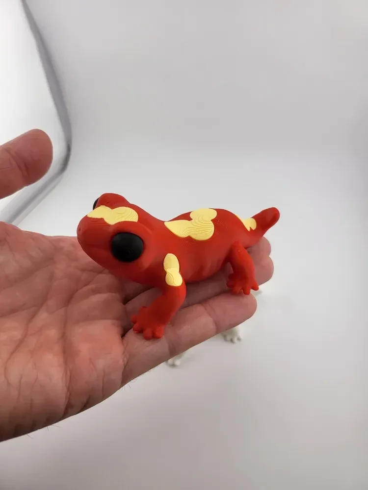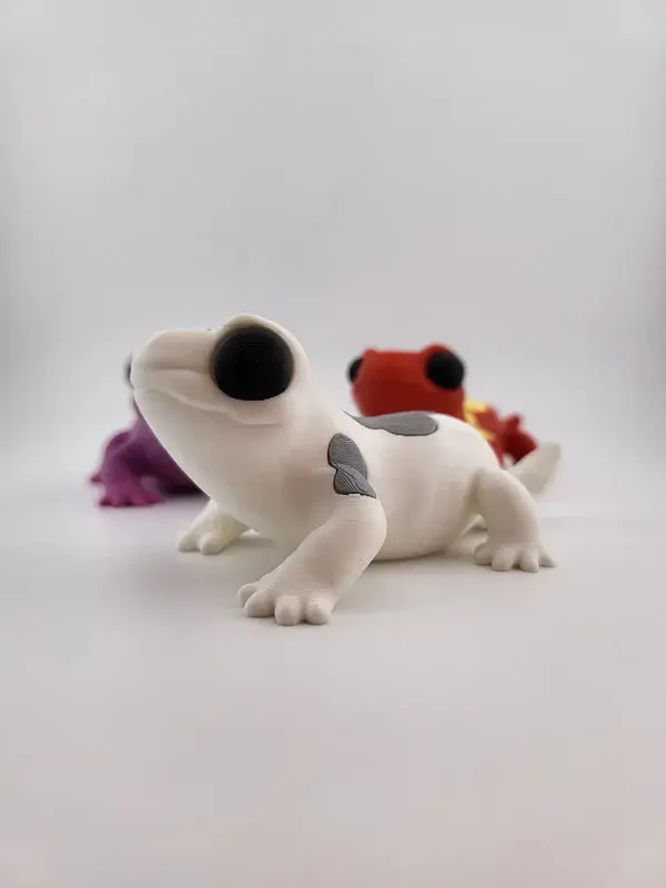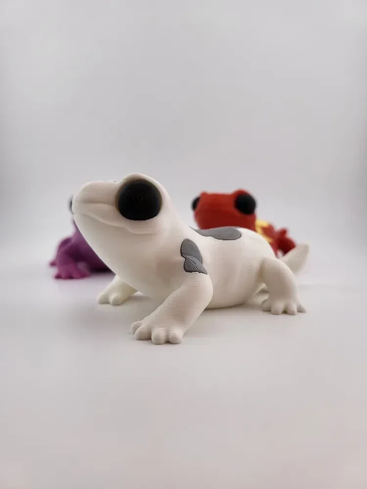 A stylised and adorable 3D-printed gecko with separate spots and eyes, perfect for colourful custom prints or cute decorative pieces.