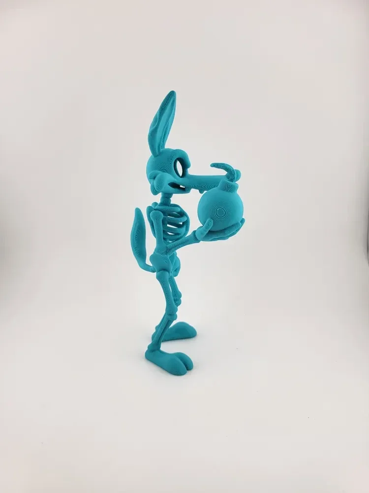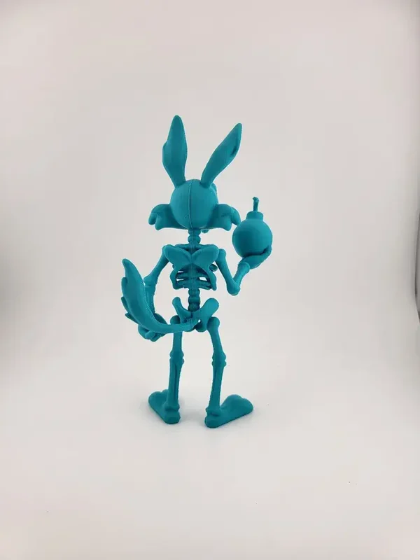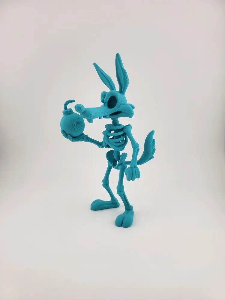 A skeleton version of Wile E. Coyote holding a bomb — cartoon-meets-macabre for quirky displays.