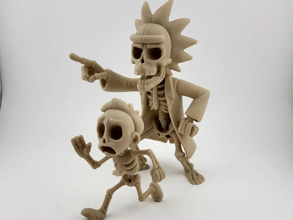 Rick & Morty in skeletal form—Rick pointing while Morty flees in dynamic motion.