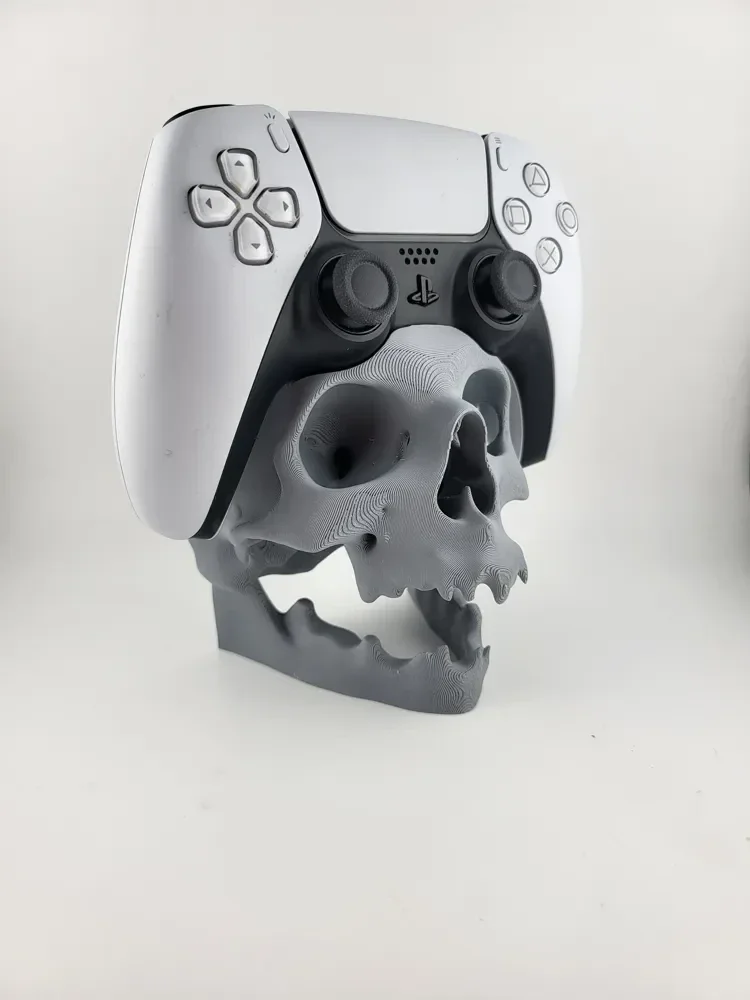 A skull-themed stand that holds both your PS5 controller and headphones — gothic, dramatic, and functional.