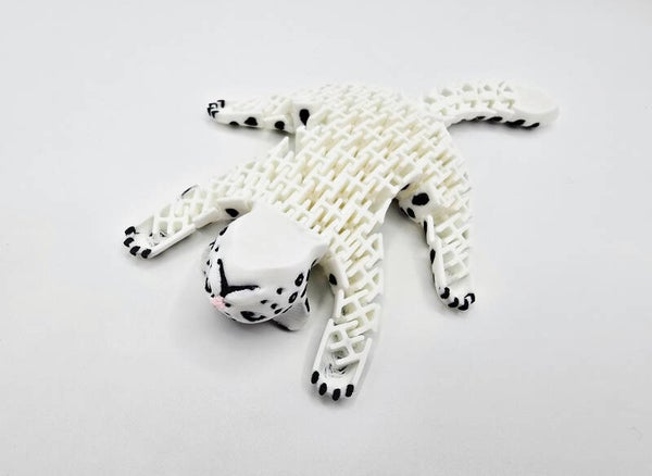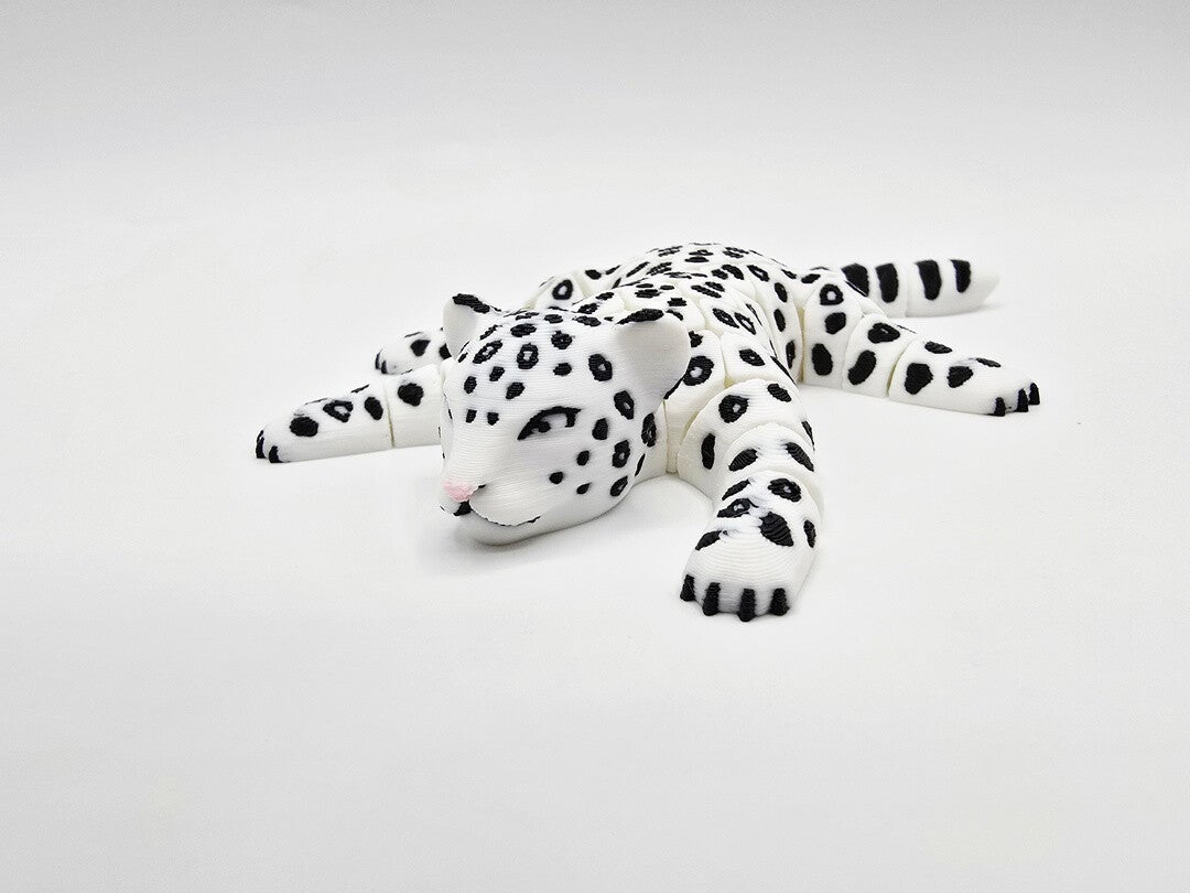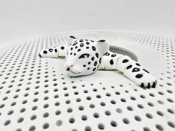 A beautifully detailed and flexible 3D-printed snow leopard with articulated body, designed as a unique collectable or display piece.