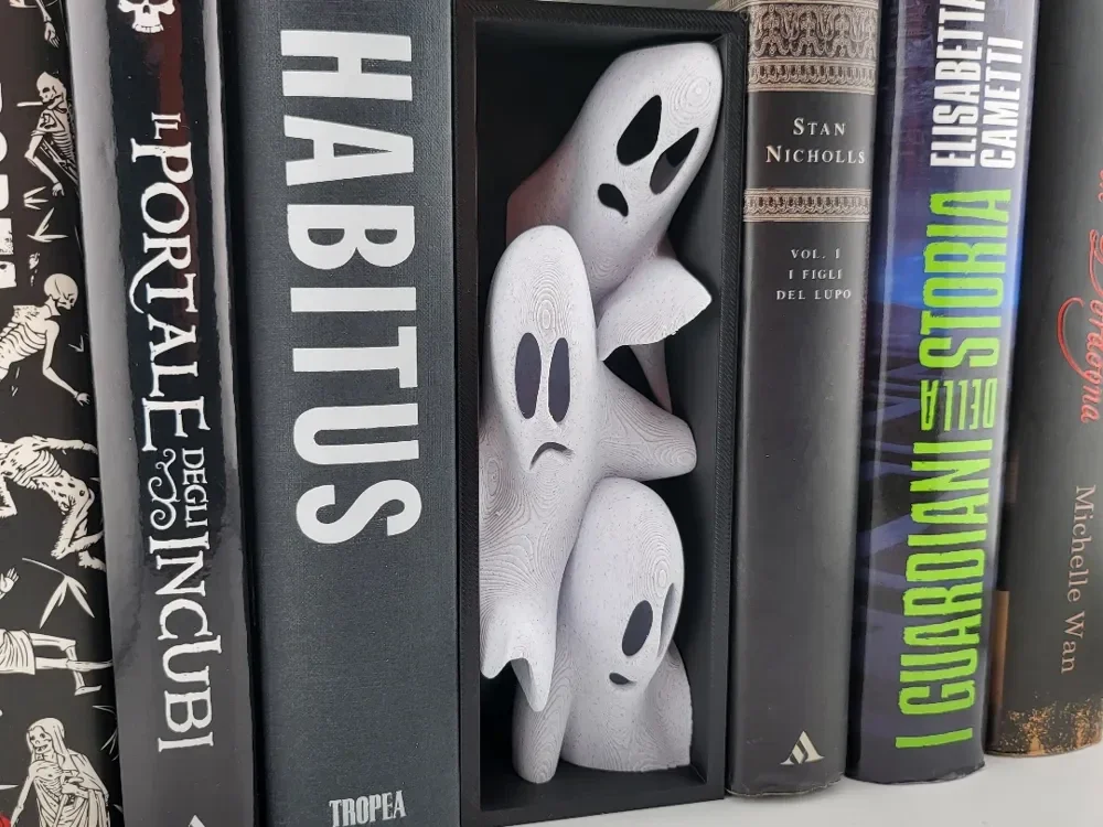 Delightfully spooky and whimsical, this miniature book nook features playful spectres peeking from within a shelf frame — ideal for horror, gothic, or fantasy décor.