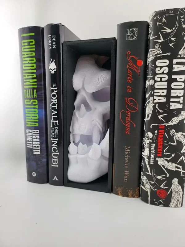 A dramatic orc-skull shaped book nook insert designed to make your shelf a striking statement piece.