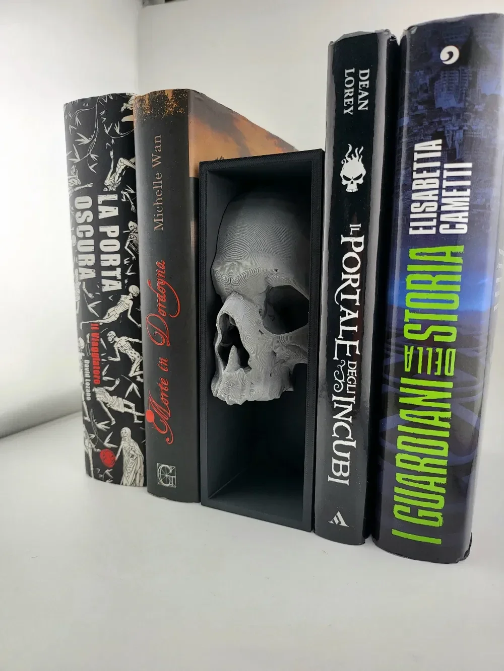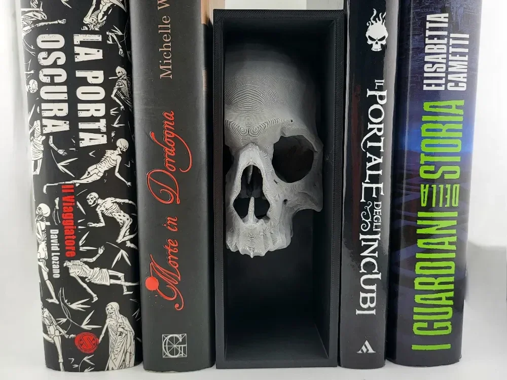 A striking 3D-printed skull-themed bookshelf insert, ideal for adding gothic flair to your reading nook.