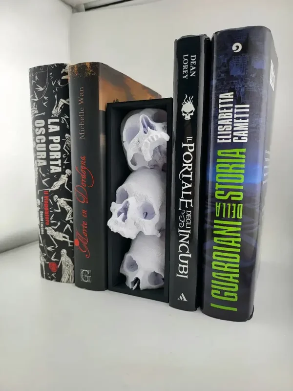A haunting three-skull Gothic bookshelf insert to add dark character to your shelves.