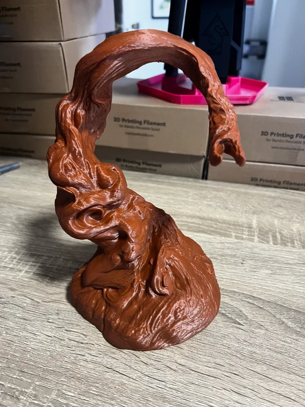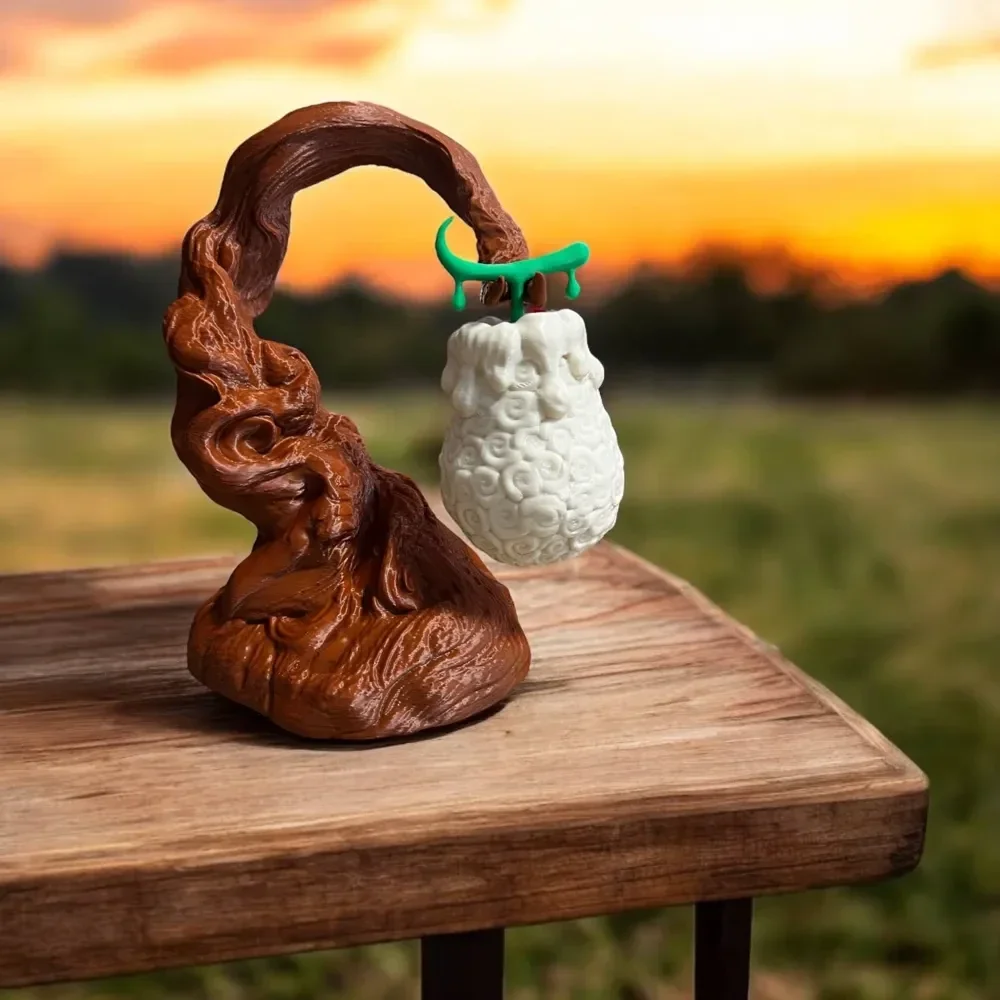 A 3D-printed Devil Fruit tree is a unique, imaginative sculpture inspired by the famous One Piece anime and manga series. The tree itself is intricately crafted with branches and roots, with the single fruit prominently displayed on its limb.