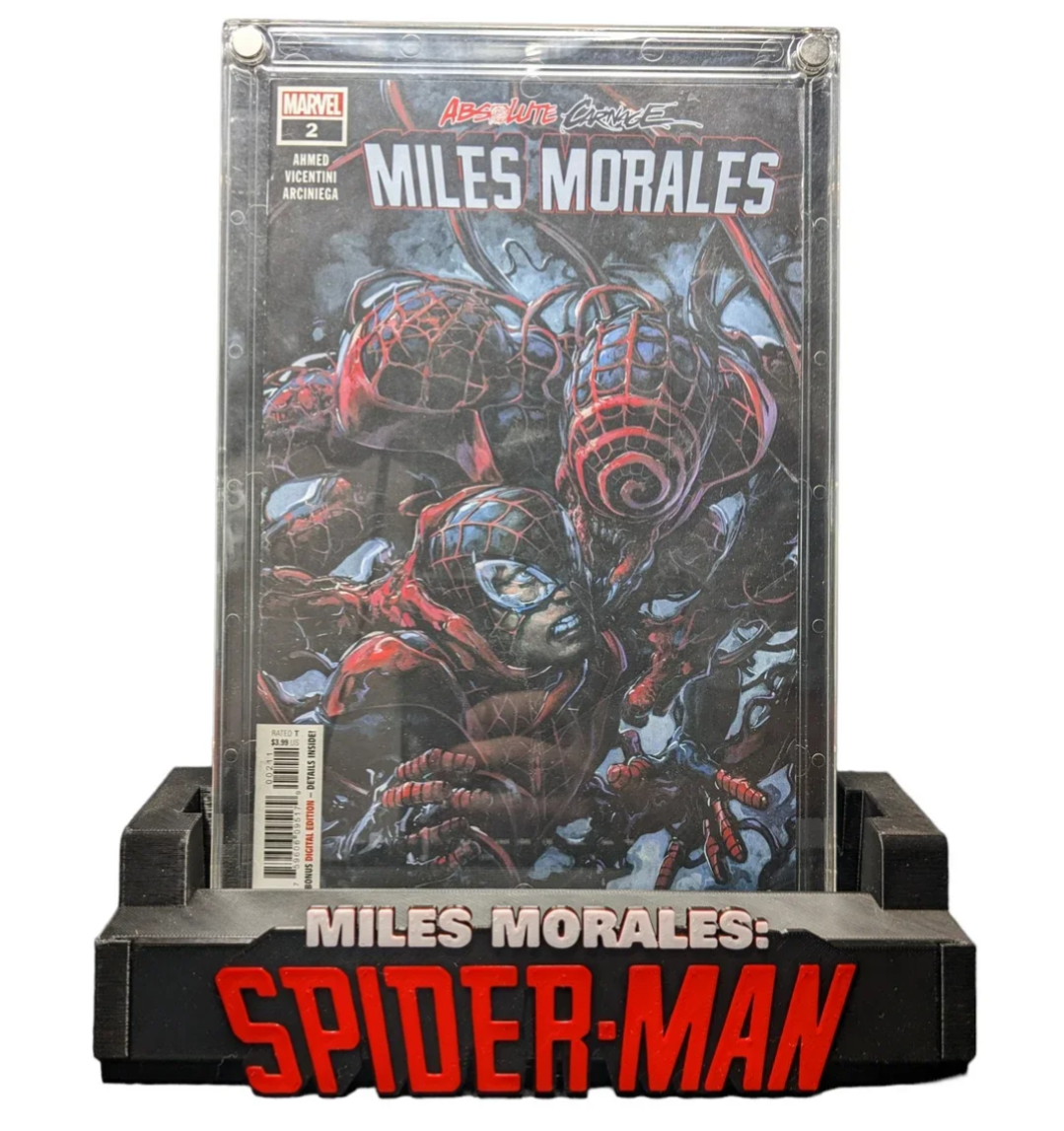 Spider-Verse Miles Morales Stand Up is designed to display both graded and raw comic books.